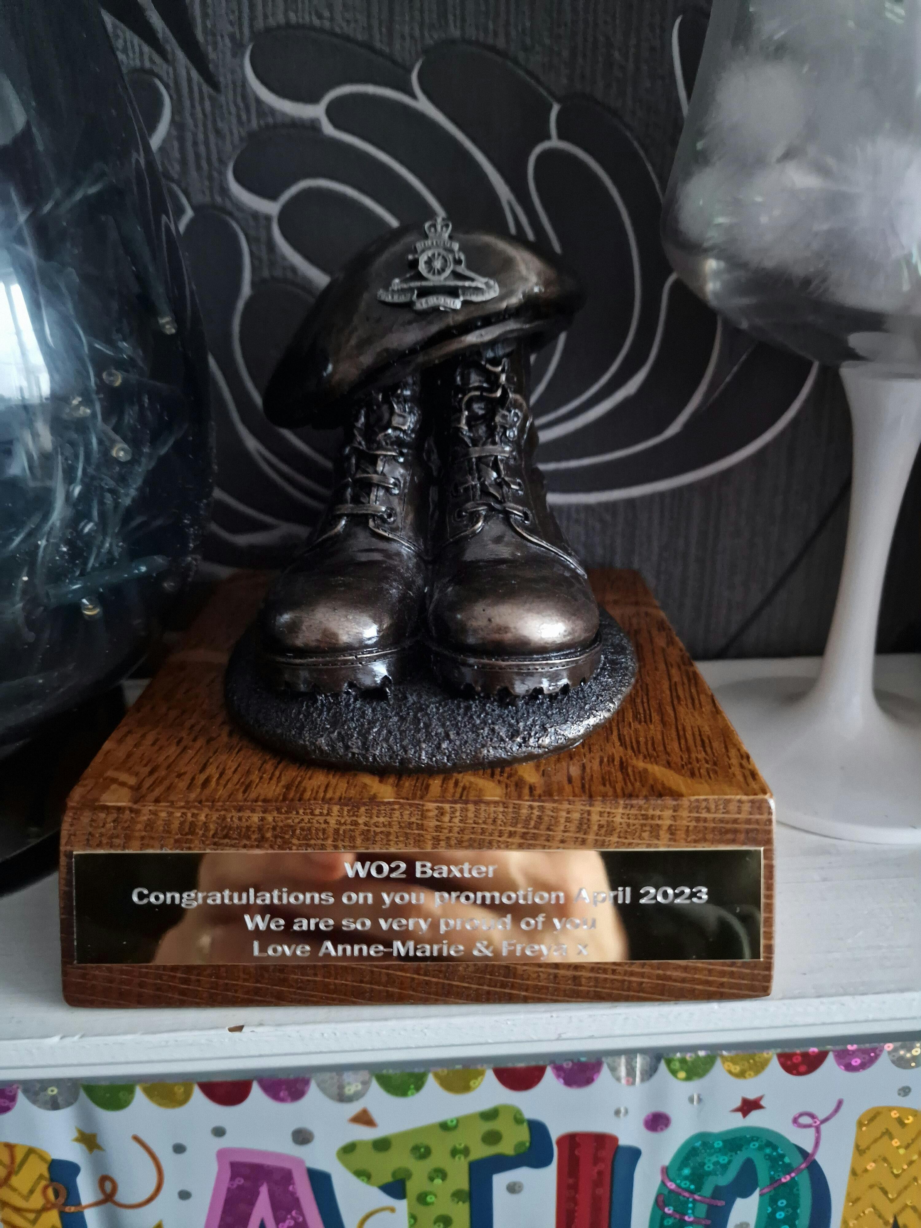 The John Bull's Beret and Boots Bronze Resin Statue on Oak Base is a striking representation of military pride and tradition. Imagine a meticulously crafted bronze resin statue proudly displayed on a polished oak base, paying homage to the dedication and service of military personnel - well you've got it now