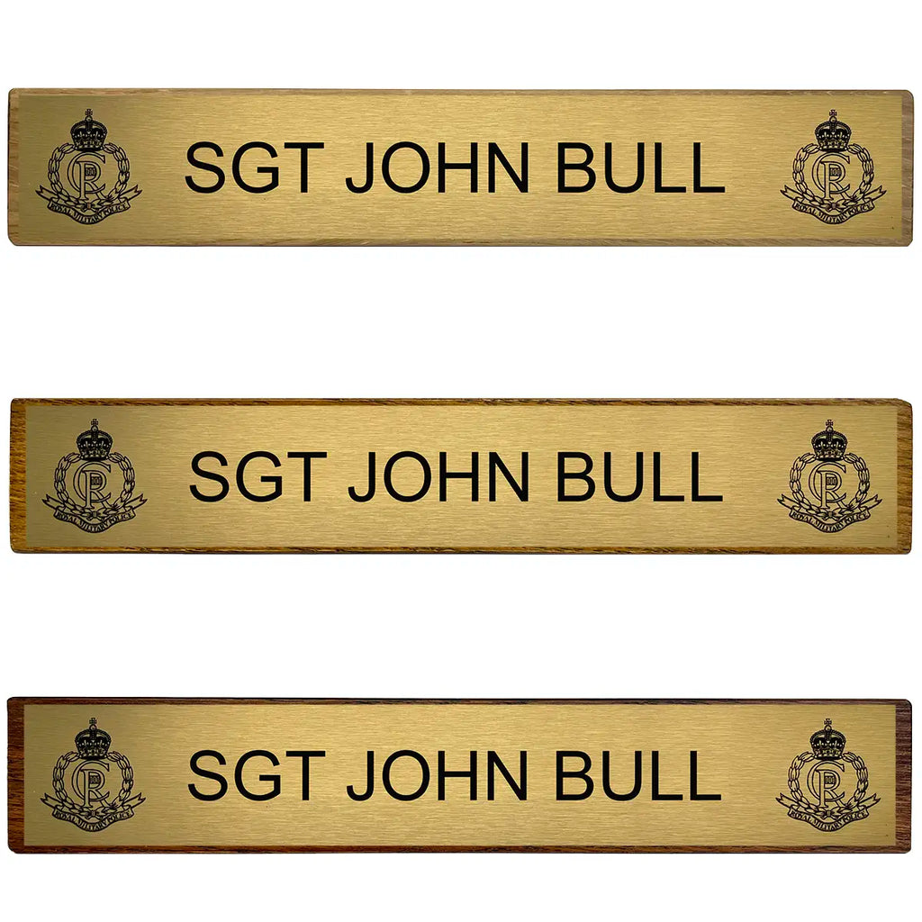 These solid wood desk name plate blocks (Toblerone Blocks) are weighty and hard wearing presentations pieces that not only take centre stage on your desk but look great featuring the gold style laminate plates with your full name and regimental cap badge etched on the surface